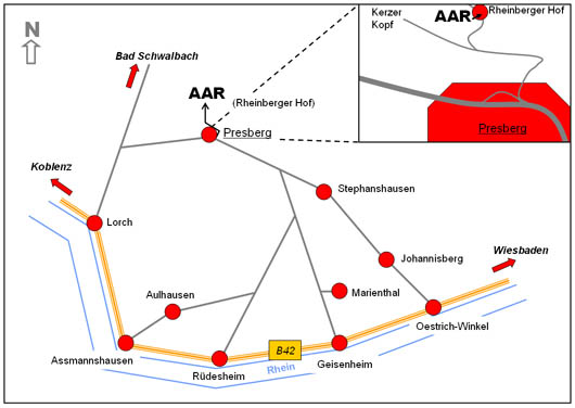 aus Richtung Wiesbaden: ebenfalls B 42 Ausfahrt Winkel West, dann Richtung Johannisberg; durch Johannisberg durchfahren und weiter in Richtung Stephanshausen; durch Stephanshausen durchfahren weiter Richtung Presberg. In Presberg ca. 20 m nach dem Ortsschild rechts abbiegen (abgesenkter Bordstein); dem Straßenverlauf folgen (rechts halten) und dann immer geradeaus. Vorsicht: Ab der Abzweigung zum Kerzer Kopf (rechts halten) wird die Straße schlecht --> langsam fahren!