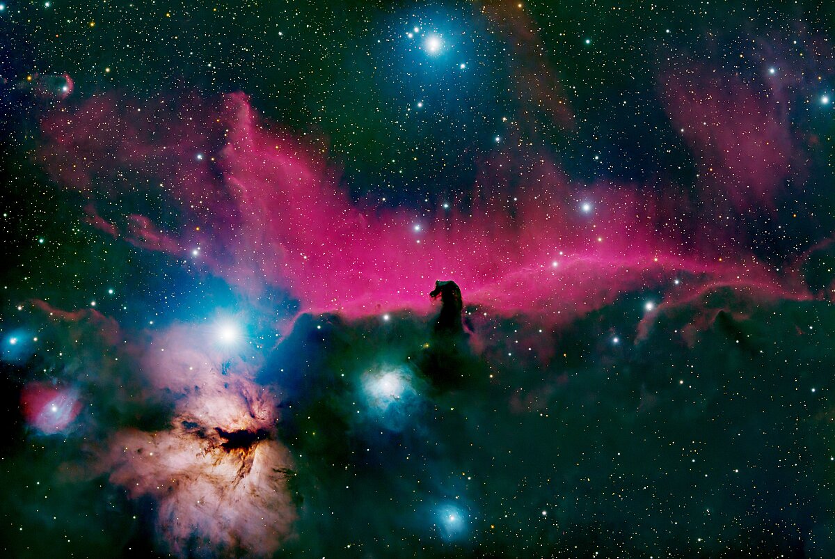 Der berühmte Pferdekopfnebel (Barnard 33) ist eine Staubwolke die das Licht der hinter ihr liegenden leuchtenden Gasmassen (NGC 2023) absorbiert. Die hierdurch sichtbar werdende Wolke besitzt eine maximale Ausdehnung von 3 Lichtjahren (Lj) und befindet sich in etwa der gleichen Entfernung von unserem Sonnensystem wie der große Orionnebel (M 42), also ca. 1500 Lj. Der Nebel bedeckt demnach etwa ein Viertel der Vollmondfläche am Himmel. Die Beobachtung mit dem Teleskop ist allerdings aufgrund des geringen Kontrastes zum Hintergrundes extrem schwierig. Ebenso wie im Orionnebel findet in diesen Gas- und Staubmassen momentan die Bildung von Sternen und Planetensystemen statt. Links unten im Bild ist der sogenannte "flammende Baum" NGC 2024 (flaming tree nebula) zu erkennen. Der extrem helle Stern links der Bildmitte ist Zeta Orionis, einer der Gürtelsterne des Orion.